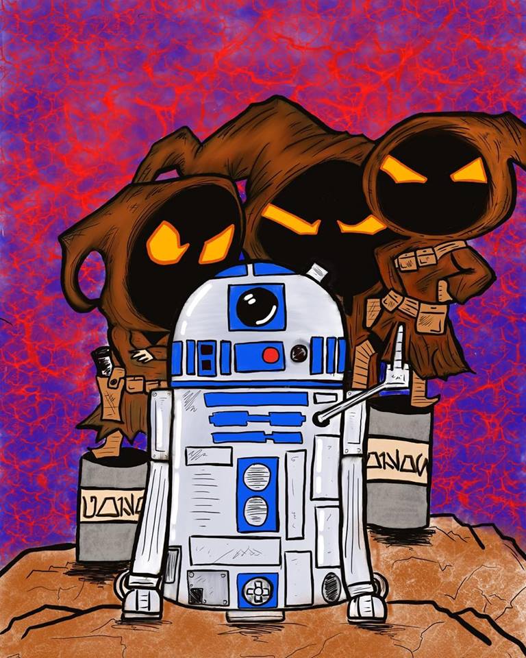 I only know one thing for sure. The level of badassery that R2-D2 and his crew of Jawas display in Scarlett Bustamante’s artwork below is precisely the level of badassery that I aspire to have. If you wish to shop for this or other prints at Scarlett’s Etsy page, find them here. For more of her work on Instagram, go here.